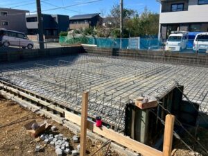 お写真は、基礎コンクリートの中の鉄筋を工事しているところになります。