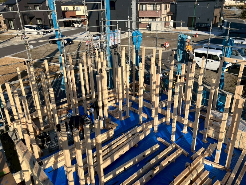 1枚目の写真:土台の上からにょきにょきと沢山の柱が建っておりますのは、先日上棟したY様邸の1階の柱です。