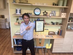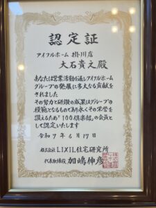 掛川店の大石です。先日、本部より『100倶楽部』達成の表彰状が届きました。内容は個人部門で累計100棟お引渡達成です。